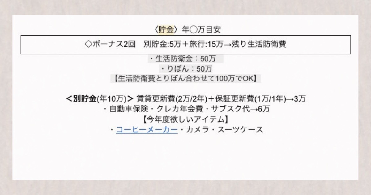 毎月の貯金だけでなく、ボーナスや年間費、賃貸更新費、サブスクなどの支出もまとめてメモしています。